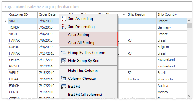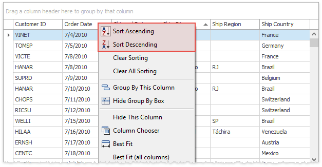 To sort data by a specific column end-users can also right-click this column’s header and select “Sort Ascending” or “Sort Descending”.